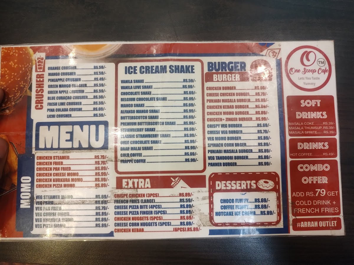 Introducing One Scoop Cafe Arrah, a charming culinary gem nestled on Buxar Road, Bihar. This cozy cafe offers a delightful menu perfect for breakfast, brunch, and quick snacks that cater to varied palates. Patrons rave about the mouthwatering burgers, touted as the best in town, and the satisfying chicken wings paired with a refreshing Blue Curacao Crusher.